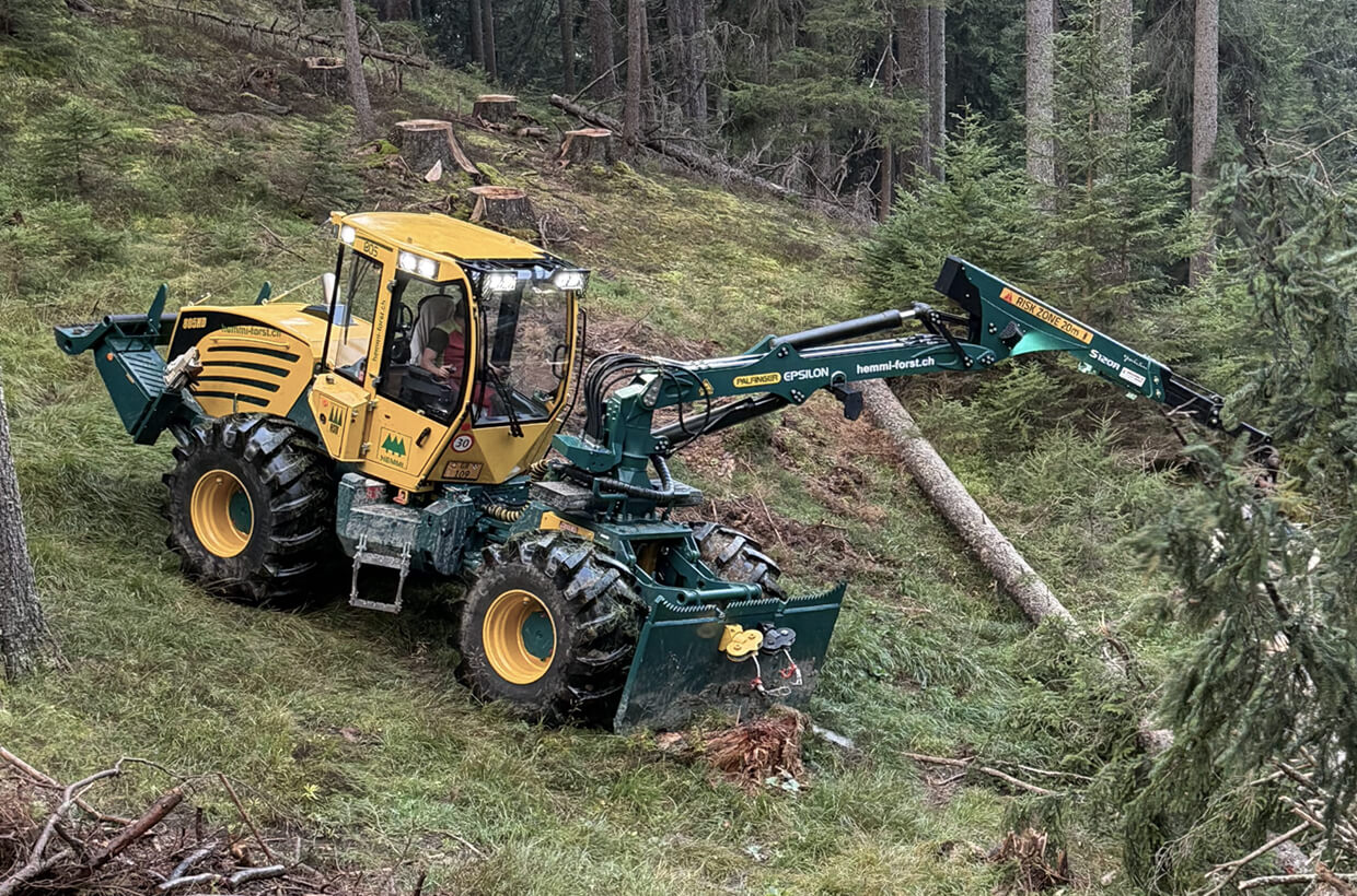 Die integrierte Stockfräse fräst den Baumstrunk und mit der Seilwinde rücken wir das geerntete Rundholz aus dem Wald hinaus. So kann die Weiterverarbeitung dort erledigt werden, wo mehr Platz vorhanden ist.